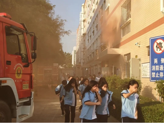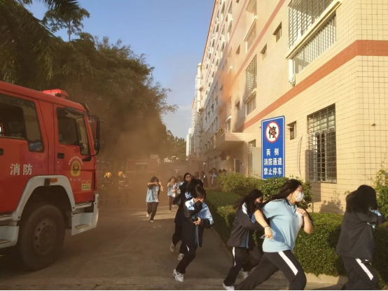 培訓結束后,我校聯合紫山消防救援站在宿舍樓組織師生進行了消防逃生疏散應急演練。參加學生用“濕毛巾”掩口掩鼻,低下身子,按照安全逃生路線,迅速有序地撤出,跑到指定的安全地帶。