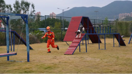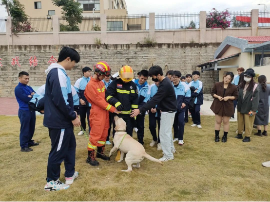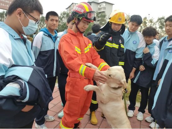 消防站工作人員向師生們?cè)敿?xì)介紹了搜救犬訓(xùn)練基地的基本情況,特別介紹了消防搜救犬,包括種類要求、日常訓(xùn)練及其生活環(huán)境等。它們是消防員的“無(wú)言戰(zhàn)友”,救援現(xiàn)場(chǎng)的“特種兵”,是有特異功能的搜救英雄。隨后師生們觀摩了搜救犬的障礙、服從訓(xùn)練,走鋼絲、鉆洞、跳躍等,敏捷的身姿贏得師生們的一陣陣喝彩。最后,在訓(xùn)導(dǎo)員帶領(lǐng)下,與搜救犬進(jìn)行友好互動(dòng),親身體驗(yàn)了搜救犬訓(xùn)導(dǎo)員與搜救犬的工作日常。