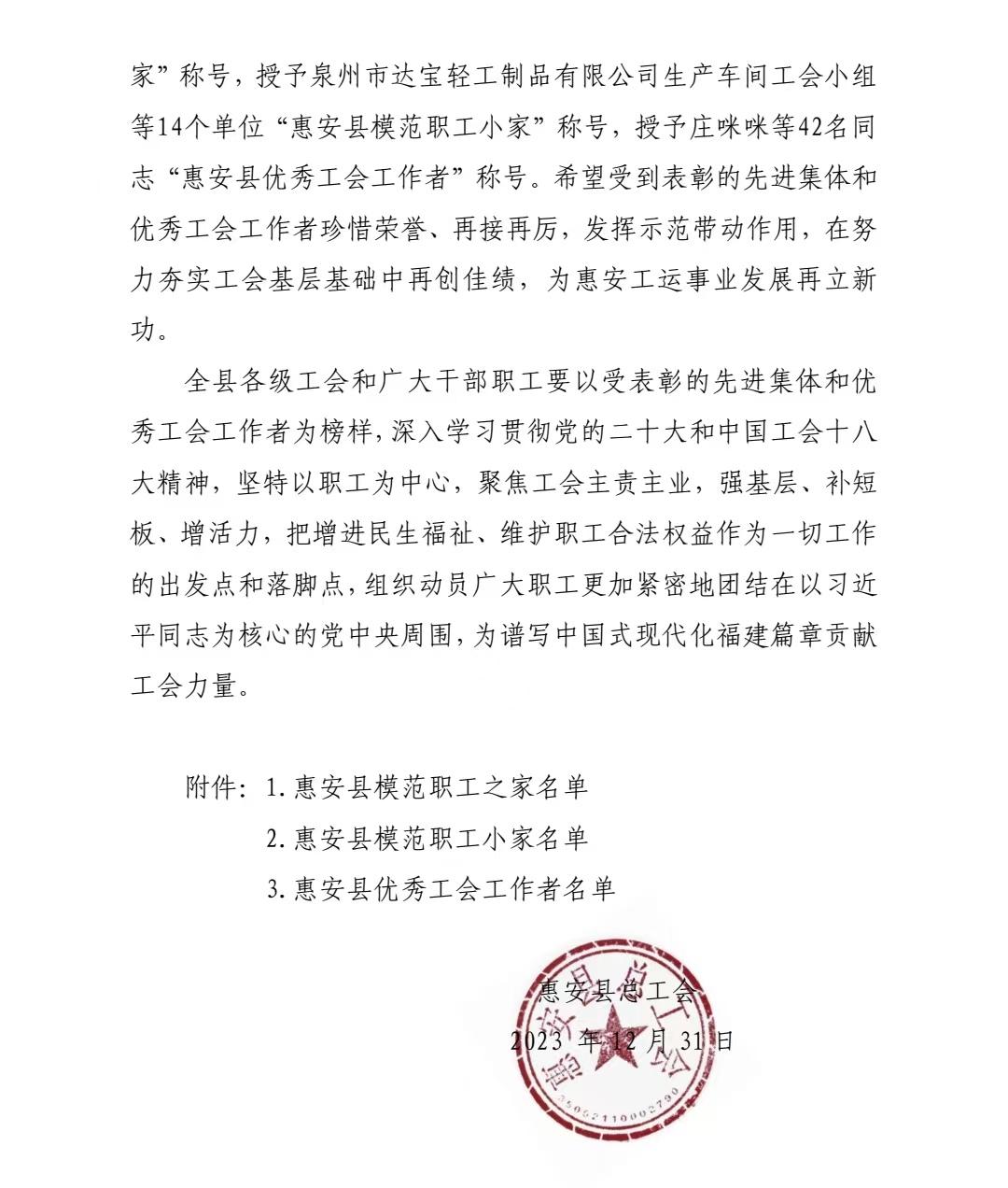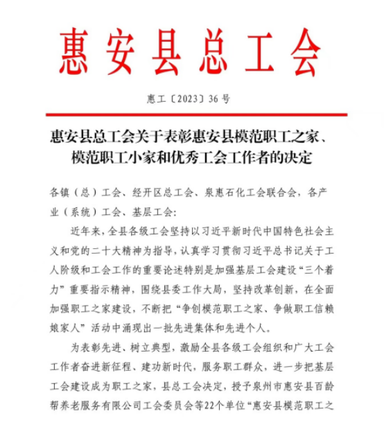 日前,惠安縣總工會(huì)下發(fā)了《關(guān)于表彰惠安縣模范職工之家、模范職工小家和優(yōu)秀工會(huì)工作者的決定》,我校工會(huì)被惠安縣總工會(huì)授予“惠安縣模范職工之家”稱號(hào)。