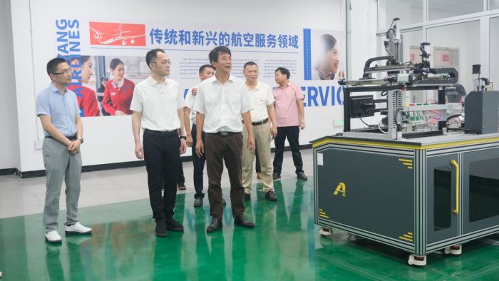 王部長(zhǎng)一行在綜合樓大廳聽取學(xué)校基本概況、辦學(xué)歷程、辦學(xué)特色的介紹,隨后實(shí)地調(diào)研了學(xué)校飛機(jī)維修、機(jī)電一體化、眼視光技術(shù)、無人機(jī)等各專業(yè)實(shí)訓(xùn)室及航空研學(xué)館,并關(guān)心了解我校產(chǎn)教融合中心的建設(shè)進(jìn)度。